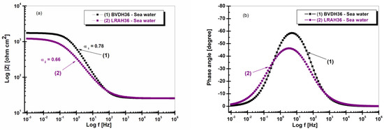 Figure 4a,b show the Bode diagrams of the two low-alloy steels, BVDH36 and LRAH36, immersed in seawater.