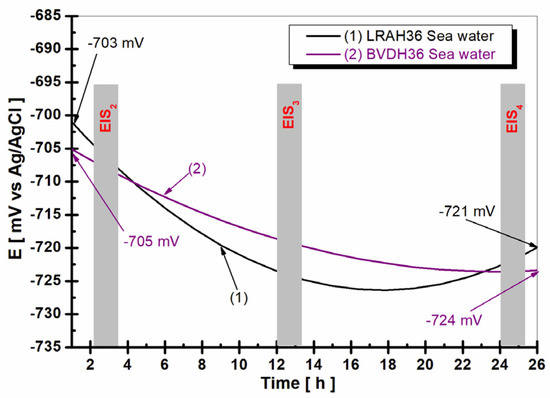 Open circuit potential evolution in seawater during 26 h of (1) BVDH36 steel; (2) LRAH36 steel. The bars show the time of impedance spectroscopy measurements.