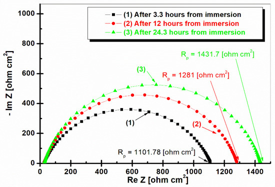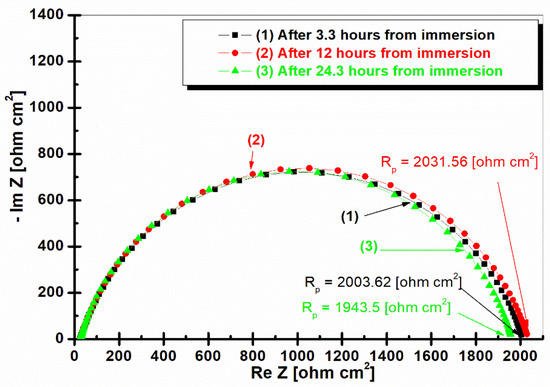 From Figure 7, it can be seen that the polarization resistance increases over time, along with the number of impedances; thus, after 3.3 h of immersion it has the lowest polarization resistance of 1101.78 ohm cm2, reaching after 24.3 h of immersion in seawater the highest polarization resistance at 1431.7 ohm cm2.