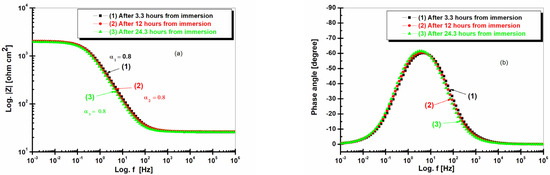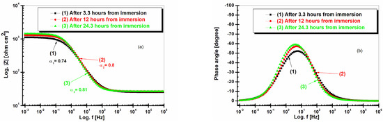 In Figure 9a, LRAH36 steel in Bode diagrams after 3.3 h of immersion, after 12 h of immersion, and after 24.3 h of immersion in seawater has maximum impedances slightly above 103 ohm cm2 between the frequencies of 10−3 and 10−1.3 Hz, and the impedance drops to 10 ohm cm2 between the frequencies of 102 and 106 Hz. From Figure 9a, LRAH36 steel has maximum impedances slightly above 103 ohm cm2, after 3.3 h of immersion, after 12 h of immersion, and after 24.3 h of immersion, respectively, which leads to the conclusion that BVDH36 steel is a little more resistant to corrosion than LRAH36 steel, where BVDH36 steel, from Figure 8a of the Bode diagrams after 3.3 h of immersion, after 12 h of immersion, and after 24.3 h of immersion, respectively, can be seen to have a maximum impedance well above 103 ohm cm2. The depressed angles are observed in Figure 9a, with α1 = 0.74 after 3.3 h of immersion, α2 = 0.8 after 12 h of immersion, and α3 = 0.81 after 24.3 h of immersion.