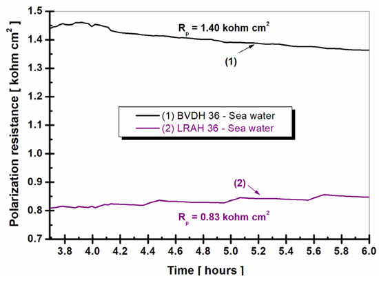 Figure 10 shows the evolution over time of the polarization resistance in natural seawater of BVDH36 and LRAH36 steels.