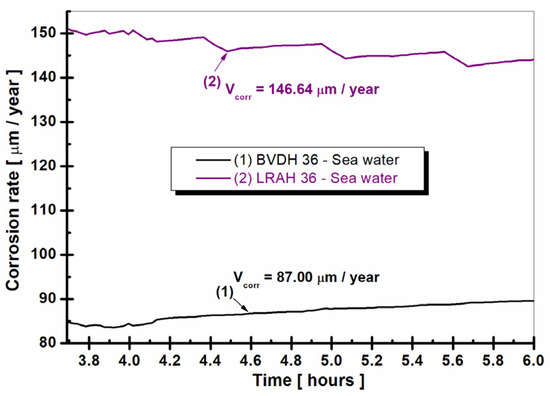 From the analysis of Figure 11, it can be seen that the average value of the corrosion rate in the case of BVDH36 steel is approximately two times lower than the value obtained by LRAH36 steel. If for BVDH36 steel we have a value of Vcorr = 87 µm/year, for LRAH36 steel we have a value of Vcorr = 146.64 µm/year, thus indicating that BVDH36 steel has a higher corrosion resistance compared to LRAH36 steel immersed in natural seawater.