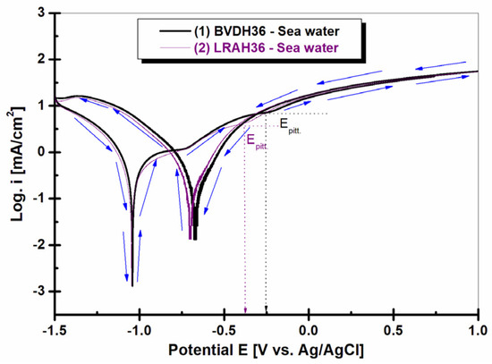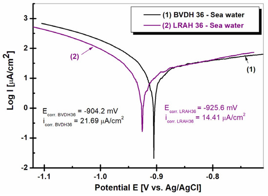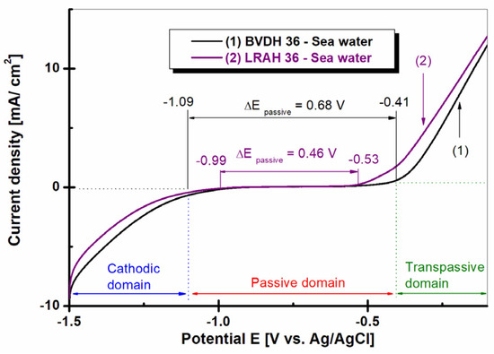 In order to investigate the effect of seawater on the passive range of BVDH36 and LRAH36 steel immersed in natural seawater, the potentiodynamic polarization curves were drawn, the results of which are presented in Figure 13.