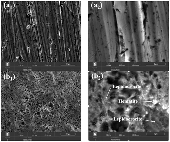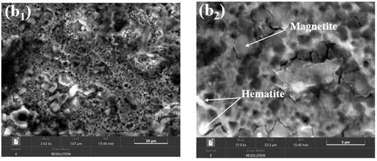 Figure 17 shows the SEM images of BVDH36 steel before (Figure 17a1,a2) and after the corrosion process (Figure 17b1,b2).