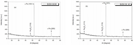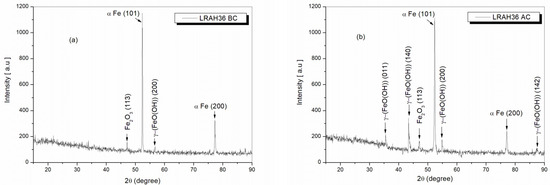 The results obtained from the SEM-EDX investigations are in good agreement with those obtained from the XRD data. Thus, for both samples of low-alloy steels before corrosion, BVDH36 and LRAH36, their surface is clean, without corrosion products, but with slight surface defects due to mechanical processing activities. In the case of BVDH36 steel after corrosion, the formed corrosion products are hematite Fe2O3 and magnetite Fe3O4. In the case of LRAH36 steel after corrosion, the entire surface of the steel is covered by an almost uniform layer of corrosion products, which consists of the compound lepidocrocite γ-FeO(OH) and hematite Fe2O3, with the observation that the corrosion product lepidocrocite is in a greater proportion than hematite.