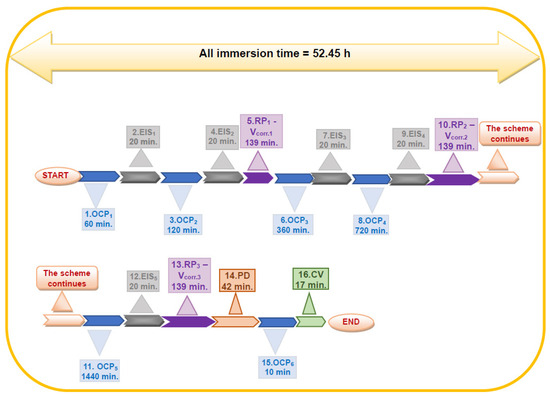 The tendency of the potential to move towards more negative values indicates that there is a dissolution of the oxide layer formed on the surface of the studied materials [3,4,5,6,7,8,9,10], with this behavior leading to a decrease in the corrosion resistance of the materials.