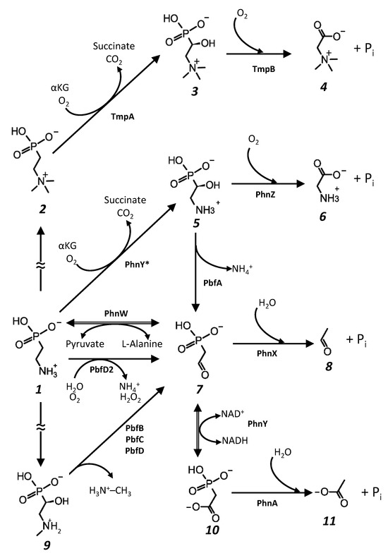 13]. Two former pathways were present in bacteria devoid of phosphonatase and served as an alternative method for the disposal of 2-AEP and its alkyl derivatives. However, novel lyases and oxidoreductases, PbfA, PbfB, PbfC, and PbfD, for which genes have been detected within phosphonatase gene clusters in certain marine bacteria, can facilitate HAEP, 2-AEP, and
