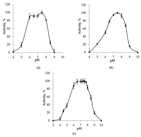 The determination of temperature optima was carried out in a working buffer within the temperature range of 25–65 °C using a UV-1800 spectrophotometer (Shimadzu, Kyoto, Japan) with thermostatted cells. Cuvettes with reaction mixtures were incubated in cells for 3 min immediately before a measurement. Enzyme preparations before their introduction into a cuvette were incubated for 1 min in a water bath of appropriate temperature. To assess their thermal stability, phosphonatase preparations were incubated at 22 °C, 45 °C, and 65 °C for 1 h, measuring the residual activity every 10 min.