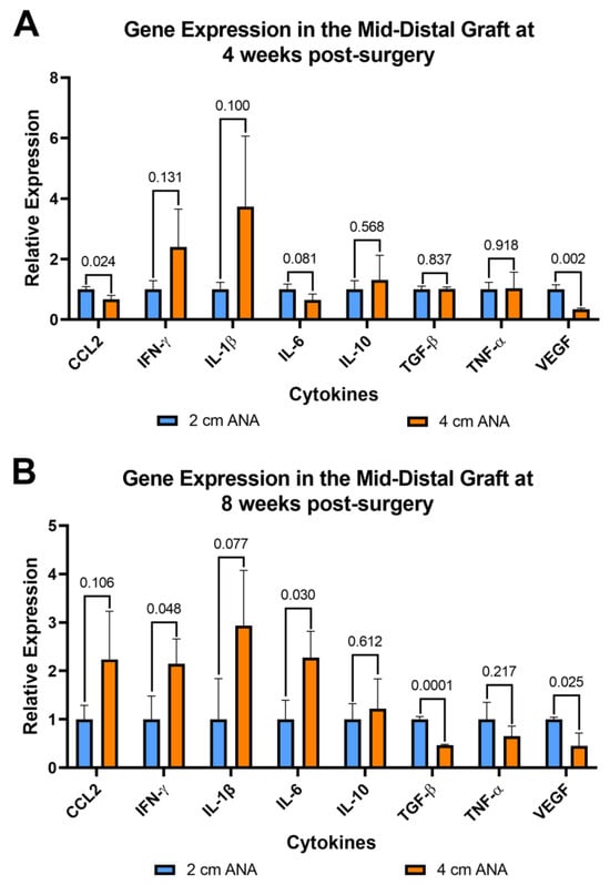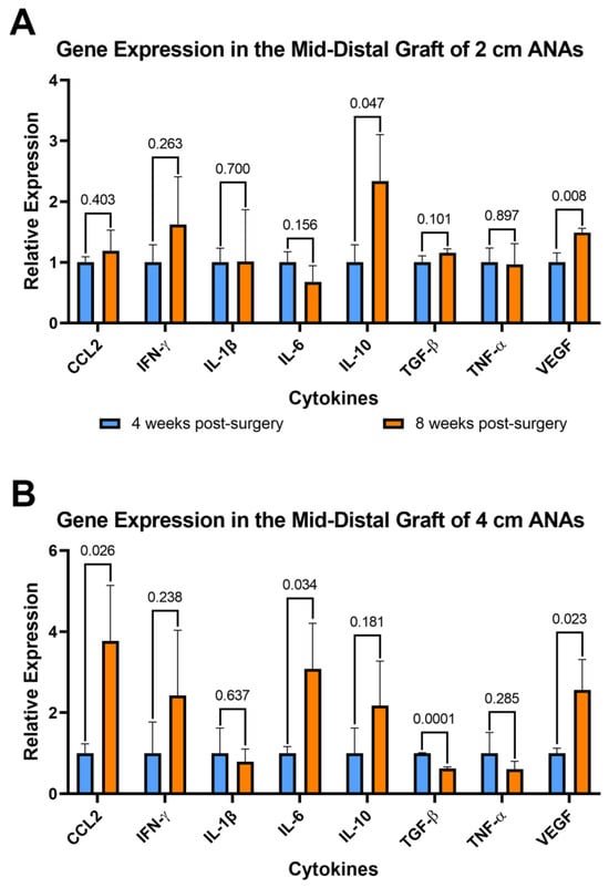 2.4.2. Expression of Pro-Inflammatory Cytokines Increase in the Mid-Distal Graft of the 4 cm ANAs as Time Progresses