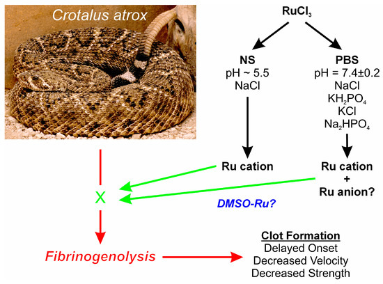 Proposed experimental design. Venoms from the species displayed are placed in NS, PBS, or NS with DMSO, with RuCl3 dissolved in water added. Fibrinogenolytic effects of the venom on clot formation (red arrows) detected by thrombelastography could potentially be inhibited by Ru compound ions (green “X” and arrows), and any diluent specific effects on venom activity would also be detected. The photograph of the snake was kindly provided by the National Natural Toxins Research Center at Texas A&M University-Kingsville, Kingsville, TX, USA.