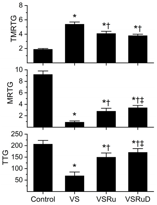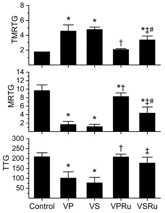Effect of DMSO in NS on RuCl3 (100 µM) exposure to C. atrox (3 µg/mL)-mediated anticoagulation. Control = plasma without additions; VS = venom in NS; VSRu = venom and RuCl3 in NS; VSRuD = venom and RuCl3 in NS with 1% DMSO (v/v) (n = 6 replicates per condition). Data presented as mean + SD. One-way ANOVA analyses with Holm–Sidak post hoc tests were utilized. * p < 0.05 vs. Control; † p < 0.05 vs. VS; ‡ p < 0.05 vs. VSRu.