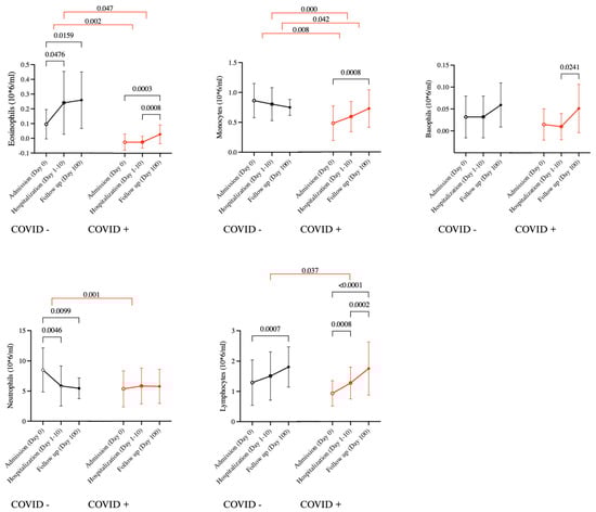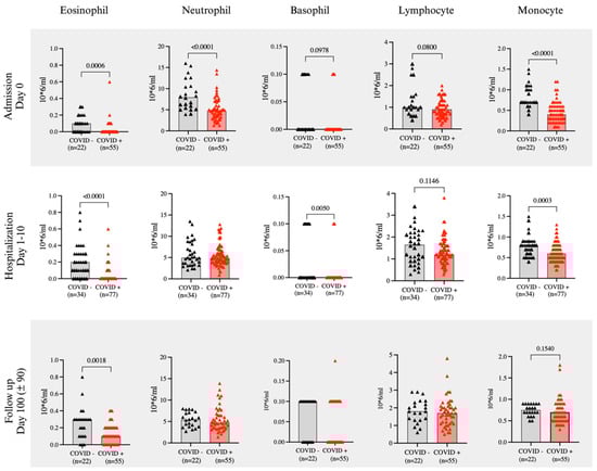Among other leukocytes, monocytes were significantly lower in COVID-19 patients during admission and after hospitalization. Monocytes play a pivotal role in cytokine storm formation in COVID-19 patients, as they produce high levels of pro-inflammatory cytokines such as IL-6 and TNF-α, contributing to an exaggerated immune response to the infection. Additionally, monocytes as well as basophils and eosinophils, have been reported to express the ACE2 receptor, which is necessary for viral entry, and studies have demonstrated their susceptibility to infection [43,44]. This dual role of monocytes in both immune response amplification and viral susceptibility may explain the observed reduction in monocyte levels in the blood of COVID-19 patients. When examining the changes in leukocyte levels from admission to hospitalization and follow-up stages, we saw a consistent trend that all cell counts increase from admission to follow-up, paralleling the process of recovery. During recovery, leukocyte numbers returned to baseline, although remaining slightly lower compared to those observed in COVID-19 negative patients. Extending the follow-up period beyond 100 days would have provided more insight into the duration needed for leukocyte levels to fully normalize.