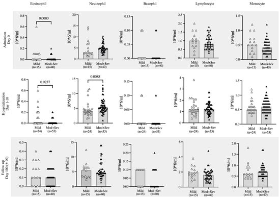 Circulating leukocytes stratified by severity of COVID-19. Comparison of leukocyte counts between mild (open symbols) versus moderate-severe (solid symbols) COVID-19 positive patients at admission, hospitalization and follow up. Statistical testing was conducted using Mann-Whitney U test. Data are shown as individual points and median, and all significant differences (p < 0.05) are reported.