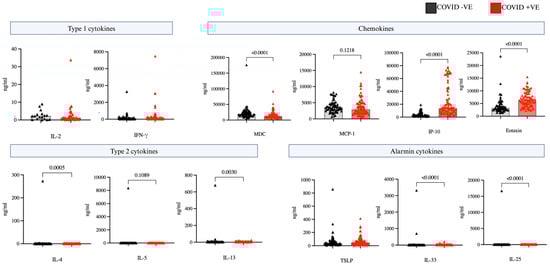 Serum samples were analyzed for 17 analytes consisting of type 1, type 2, and alarmin cytokines, as well as chemoattractant levels using an ultra-sensitive human cytokine multiplex electrochemiluminescence-based immunoassay (Meso Scale Discovery, Gaithersburg, MD, USA). The assay was conducted on the MESO QuickPlex SQ 120MM instrument (MSD) according to the manufacturer’s protocol. Protein levels were quantified in picograms per milliliter of blood (pg/mL).