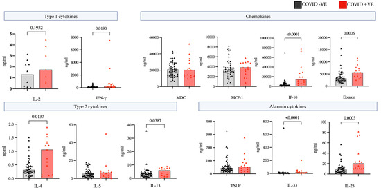 Circulating cytokines and chemokines in patients not administered steroid treatment. Comparison of circulating levels of cytokines and chemokines between COVID-19 positive and COVID-19 negative patients during hospitalization (day 1–10). No patients were being treated with corticosteroids at the time of sampling. Statistical testing was conducted using Mann-Whitney U test, and all significant differences (p < 0.05) are reported. Lower limit of detection in pg/mL (LLOD): IL-2 (0.09), IFN-γ (0.37), MDC (1.00), MCP-1 (0.16), IP-10 (0.12), eotaxin (0.2), IL-4 (0.02), IL-5 (0.14), IL-13 (0.24), TSLP (0.063), IL-33 (0.59), IL-25 (0.28).