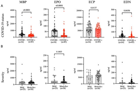 Circulating eosinophil granule proteins. Comparison of the level of circulating eosinophil granule proteins between (A) COVID-19 positive versus COVID-19 negative patients, and between (B) mild versus moderate-severe COVID-19 positive patients during hospitalization (days 1–10). All data are shown by median (range). Statistical testing was conducted using Mann-Whitney U test, and all significant differences (p < 0.05) are reported.