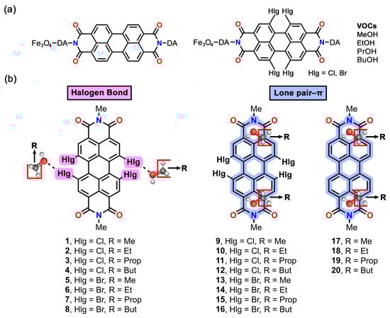 In this study, Fe3O4 nanoparticles (FeNPs) decorated with halogenated perylene diimides (PDIs) have been used for capturing VOCs (volatile organic compounds) through noncovalent binding. Concretely, we have used tetrachlorinated/brominated PDIs as well as a nonhalogenated PDI as a reference system. On the other hand, methanol, ethanol, propanol, and butanol were used as VOCs. Experimental studies along with theoretical calculations (the BP86-D3/def2-TZVPP level of theory) pointed to two possible and likely competitive binding modes (lone pair–π through the π-acidic surface of the PDI and a halogen bond via the σ-holes at the Cl/Br atoms). More in detail, thermal desorption (TD) experiments showed an increase in the VOC retention capacity upon increasing the length of the alkyl chain, suggesting a preference for the interaction with the PDI aromatic surface. In addition, the tetrachlorinated derivative showed larger VOC retention times compared to the tetrabrominated analog. These results were complemented by several state-of-the-art computational tools, such as the electrostatic surface potential analysis, the Quantum Theory of Atoms in Molecules (QTAIM), as well as the noncovalent interaction plot (NCIplot) visual index, which were helpful to rationalize the role of each interaction in the VOC···PDI recognition phenomena.