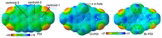 Electrostatic potentials (V, in kcal/mol) computed at the Cl/Br σ-hole (Vσ-hole) as well as several parts of the PDI aromatic core (Vcentroid-1, Vcentroid-2, and Vcentroid-3, see Figure 2). The MEP minima (Vmin) and maxima (Vmax) are also indicated.