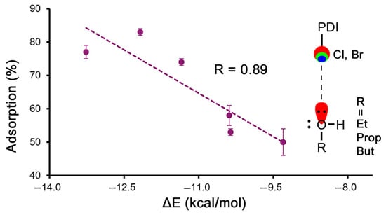 Lastly, in Figure 3, we represented the percentage of adsorption vs. the interaction energies for those complexes involving the HlgB binding mode (1 to 8), with the exclusion of complexes 1 and 5 involving MeOH, owing to the different tendency observed in the results shown in Table 1. Remarkably, a good correlation between the adsorption percentages and the interaction energies was found (R = 0.89). Such a correlation supports the HlgB-based recognition mode between the VOCs and the Cl/Br atoms from the PDI moiety while also representing a direct correlation between the computational interaction energies of the HlgB complexes and the experimental adsorption data. On the contrary, if the same representation is carried out in the case of the lp-π-based complexes (9 to 20), again, without considering complexes 9, 13, and 17 involving MeOH, a poor correlation coefficient was obtained between the adsorption percentages and the interaction energies (R = 0.60), indicating that the VOC recognition mechanism over the PDI π-surface is not solely based on a combination of lp-π and CH-π interactions.