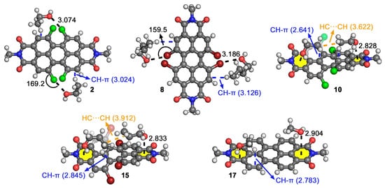 Optimized geometries of complexes 2, 8, 10, 15, and 17 at the BP86-D3/def2-TZVPP level of theory. Ancillary CH-π and CH···HC interactions are highlighted in blue and orange, respectively. The intermolecular distances and angles are also indicated in Å and °, respectively.