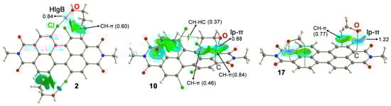 Distribution of intermolecular bcps (red dots) and bond paths in complexes 2, 10, and 17. Ancillary CH···HC and CH-π interactions are also indicated. The values of the density (ρ·102) related to the HlgB, lp-π, as well as ancillary interactions are also included in a.u. NCIplot color range −0.02 au ≤ (signλ2)ρ ≤ +0.02 au.