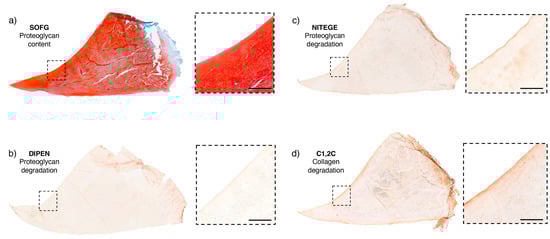 Site-matched ROI sections from a healthy meniscus stained with SOFG, NITEGE, DIPEN, and C1,2C. These sections are from a 5-year-old horse. They represent healthy tissue as the HEPS histological score was 0, the lowest possible, revealing an intact structure. (a) The SOFG-stained section reveals an intact meniscal structure with uniform uptake of the stain but slightly paler in the centre. The splits are artefacts. The broken box corresponds to the magnification on the right, revealing a smooth, intact femoral surface. The SOFG score was 0. (b) The DIPEN score was also 0, revealing no immunostaining. (c,d) Both the NITEGE and C1,2C were attributed a score of 1 as the magnified images reveal some uptake of the immunostain on the femoral surface. Key: SOFG—safranin O fast green scale bar: 500 µm.