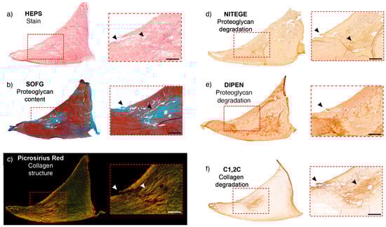 Site-matched meniscal ROI sections revealing central or intrasubstance extracellular matrix changes, including proteoglycan loss and focal degradation of proteoglycan and collagen molecules combined with disruption of collagen structure. The meniscal ROI is from a 26-year-old horse with a partial tear in the meniscus. The dashed rectangles in the right panel of the image illustrate sites of corresponding magnified inserts. Arrowheads highlight surface and central anomalies. (a) HEPS-stained sections. (score 6) This section reveals disruption of structure that includes an abnormal structure with loss at the inner border, a partial tear from the femoral surface, disorganized tissue centrally, and loss of tissue on the tibial surface. (b) The SOFG-stained section reveals a focal pale blue area centrally, corresponding to proteoglycan loss and also at the surface (Score 2). There appears to be a loss of tissue structure also at this site on the magnified insert to the right. (c) The corresponding site-matched picrosirius-stained section and magnified insert clearly illustrate the loss of the organized collagen structure within the lesion and also the inner border changes observed in (a). (d) A site-matched section to (a) where the NITEGE antibody has a background generalized uptake with a focal enhanced uptake centrally (Score 2) revealing increased central degradation of proteoglycan molecules. (e) DIPEN-stained section score 3. (f) A site-matched C1,2C-stained section to (a) shows a clearly demarcated enhanced uptake centrally but also peripherally (Score 2). This section appears to have a loss of collagen at the inner border in addition to the central lesion. Scale bar = 1 mm.