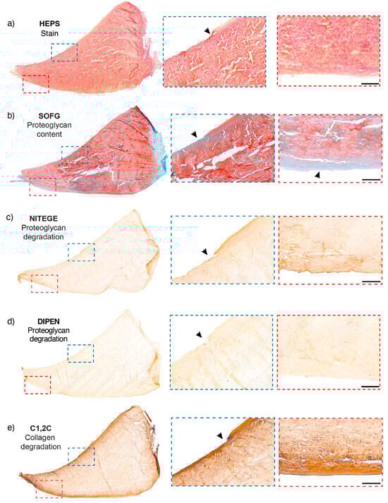 Site-matched meniscal ROI sections from a meniscus of a 10-year-old horse. (a) HEPS-stained section. Loss of tissue at the inner border is evident. An erosion of tissue on the femoral surface is evident (arrowhead in magnified image). The ROI histological score was 8. (b) SOFG-stained section revealing a focal loss of proteoglycan content at the femoral and tibial surfaces (Score 1). The disrupted architecture in the middle is a processing artefact as meniscal tissue is challenging to section. The dashed rectangles to the right of the image illustrate sites of corresponding magnified inserts and arrowheads are pointing at the identified lack of proteoglycan (decreased red stain). (c) A section immunostained with NITEGE, a degradation product of proteoglycan (Score 1). There is increased uptake at the femoral and tibial surfaces when compared to similar regions within the same section. The magnified images on the right illustrate the enhanced uptake of the immunostain. (d) A section toimmunostained with DIPEN (score 0). No staining is evident. (e) A section an increased uptake of the C1,2C antibody for collagen degradation at both the femoral and tibial surfaces and inner border (Score 1), at the level of the previously identified proteoglycan loss in this ROI. Scale bar = 500 µm.