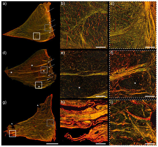 Some menisci exhibited evident loss of collagen organization on the surfaces and at the inner border. Although the tie fibres extending from the outer meniscal border and the bundles from the lamellar surfaces were less defined, they were still present (Figure 5g–i). Additionally, a decrease in collagen density in the meniscal core was observed in some sections, consistent with an intrasubstance degenerative process (Figure 5). In a specimen sourced from a clinically diagnosed OA compartment, an open lacey pattern with small holes was observed when compared to age-matched specimens (Figure 5).