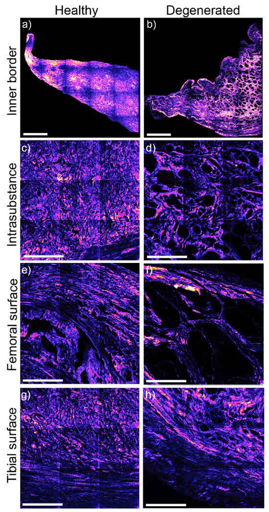 Equine meniscal ROI collagen ultrastructure with second harmonic generation microscopy (SHGM) in healthy and degenerated specimens. The samples are imaged from key meniscal sites (inner border, intrasubstance, and both the femoral and tibial surfaces) from a control section from an 8-year-old horse and with site-matched degenerate meniscal tissue from a 23-year-old horse. The healthy control collagen structure is compact and organized (a,c,e,g) when compared with the degenerate samples on the right (b,d,f,h). In the samples with disease, there is an evident loss of collagen ultrastructure, and small (b,d,h) to larger holes (f) that give it a lacey appearance (b,d,f) and represent a loss of collagen molecules from the tissue. Scale bars of images (a,b) = 200 µm. Scale bars for images (c–h) = 300 µm.