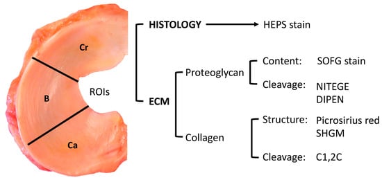 The inter-observer agreement for histological, SOFG, NITEGE, DIPEN, and C1,2C ROI scores was assessed with a weighted Kappa test. Cochran–Mantel–Haenszel tests were employed to explore the relationship in ROIs between meniscal structural degeneration (histological scores) and ECM degradation (SOFG, NITEGE, DIPEN, and C1,2C scores) from site-matched sections. A level of p < 0.05 was considered statistically significant (SAS v. 9.4 (Cary, NC, USA) software).
