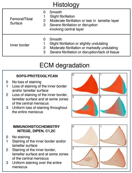 Criteria for the meniscal ROI histological and extracellular matrix scores. The histological score was the same as employed previously []. The femoral and tibial surfaces and inner border were all scored for structural changes employing a score from 0 to 3. The extracellular matrix proteoglycan content (SOFG) score (0–3) was based on the pattern and extent of the SOFG staining within the section. The immunohistochemical scores for proteoglycan (NITEGE and DIPEN) degradation and for collagen (C1,2C) ranged from 0 to 3. The accompanying atlas schema illustrates the score patterns.