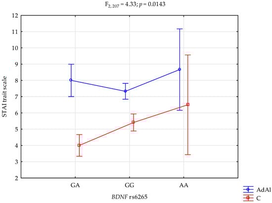 Interaction between the alcohol use disorder subjects (AdAl), controls (C), and BDNF rs6265 and STAI trait scale.