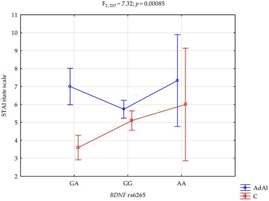 Interaction of the alcohol use disorder subjects (AdAl), controls (C) and BDNF rs6265 and STAI state scale.