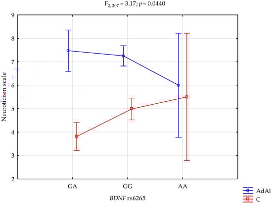 Interaction of the alcohol use disorder subjects (AdAl), controls (C), and BDNF rs6265 and neuroticism scale.