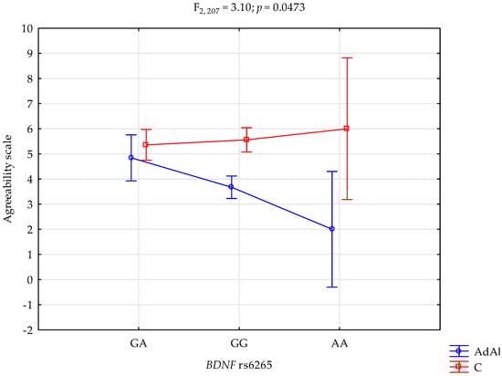 Interaction of the alcohol use disorder subjects (AdAl), controls (C), and BDNF rs6265 and agreeability scale.