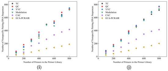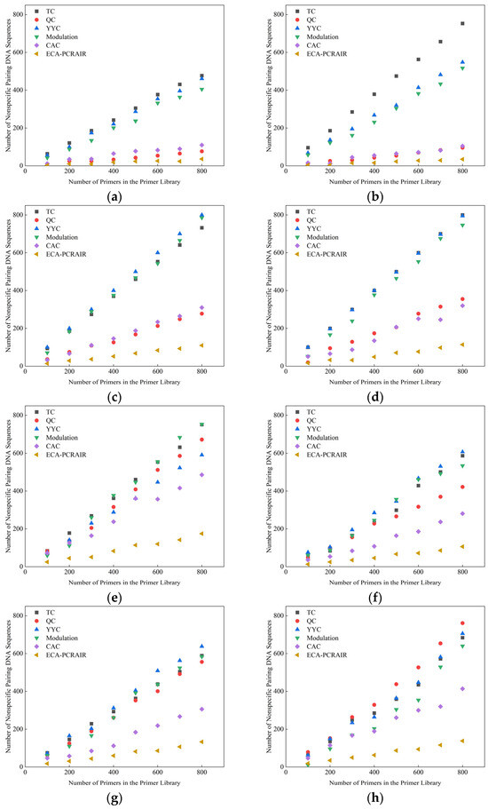 The experimental results demonstrate that the probability of nonspecific pairing between the DNA sequence and the 3’ end of the primer in the traditional QC algorithm ranges from 10% to 76%, while in the TC algorithm, it is between 71% and 99%. For the YYC, Modulation, and CAC algorithms, the probabilities of nonspecific pairing are 64% to 94%, 10% to 98%, and 7% to 72%, respectively. The ECA-PCRAIR algorithm exhibits a significantly lower nonspecific pairing probability, ranging from 2% to 25%. This substantial reduction highlights the superior ability of the ECA-PCRAIR algorithm in mitigating nonspecific pairing compared to the other five algorithms, thereby indicating its exceptional effectiveness in addressing the nonspecific pairing constraint.