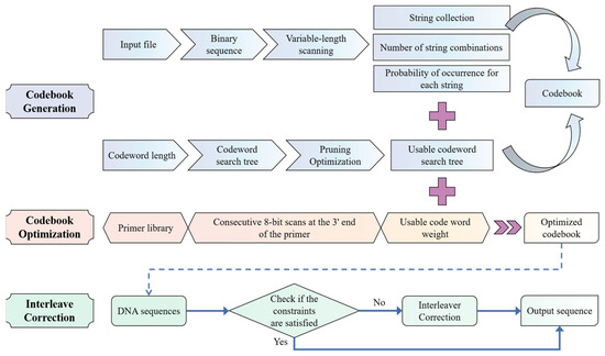 26]. To ensure that the DNA sequences meet both constraints and to enhance the accuracy of PCR amplification, we propose an efficient DNA coding algorithm for PCR amplification information retrieval. This algorithm employs pruning optimization and variable-length scanning to adaptively establish a file coding codebook with the maximum theoretical storage density while adhering to traditional biological constraints. A codeword search tree is constructed based on the statistical characteristics of primers to optimize the codebook and minimize nonspecific pairing. Additionally, the variable-length interleaver, based on primers, interleaves the DNA sequence to further ensure compliance with biological constraints and reduce nonspecific pairing. This algorithm not only effectively addresses the problem of nonspecific pairing but also enhances storage density and reduces the cost of DNA synthesis. Furthermore, the algorithm is universal and suitable for efficient coding of files in arbitrary formats.