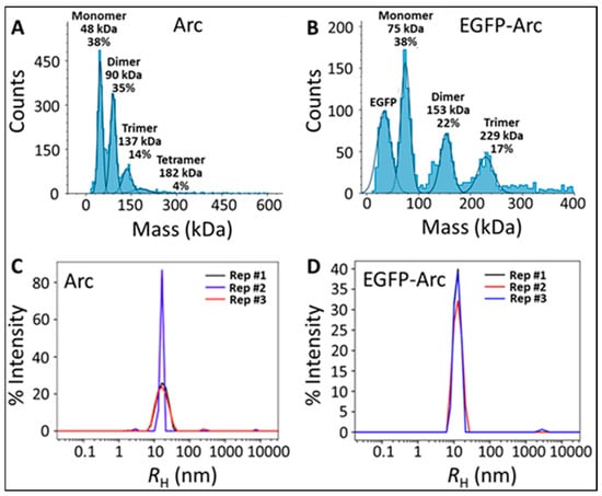To date, high-order Arc oligomerization in solution has been characterized predominantly by dynamic light scattering (DLS) at Arc concentrations in the µM range [8,9,10,11]. To examine Arc self-association at lower concentrations, we used mass photometry, which has a sensitivity range of ~100 pM to ~100 nM. Mass photometry provides estimates of the molecular mass of proteins larger than ~30 kDa by quantification of the light scattered by individual particles upon binding to glass coverslips. We observed that bacterially expressed mouse Arc at ~20 nM concentration exists predominantly in a monomer/dimer/trimer equilibrium, with much lower levels of tetramers also evident (Figure 1A). Consistent with previously published values obtained by DLS and electron microscopy, the average hydrodynamic radius (RH) of Arc at this concentration was 17.0 ± 0.4 nm (Figure 1C). There was no evidence of low-order oligomers (monomers, dimers, etc.) in the DLS profiles. However, because the intensity of light scattered is proportional to the sixth power of the particle diameter, the contribution to the total light scattered by monomers and dimers is expected to be very small in the presence of ~30 nm diameter Arc particles.