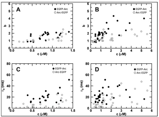 We performed single-point FFS analyses over a broad range of concentrations (~200 nm to ~5 µM) in U2OS cells. Brightness analyses (Figure 2A,B) indicated that cytoplasmic particles containing EGFP-tagged Arc have an average stoichiometry of 1–3 Arc molecules per particle. Autocorrelation analysis (Figure 2C,D) revealed that the diffusion times (τD, which are inversely related to the diffusion coefficient, D) of EGFP-Arc and Arc-EGFP increase as a function of concentration. Soluble proteins with the molecular masses of EGFP-tagged monomeric, dimeric, and tetrameric Arc would be expected to have diffusion times of about 1.3, 1.6, and 2.0 ms, respectively. However, the measured diffusion times were scattered between ~2 and ~50 ms, confirming our previously reported observation that the diffusion process is dominated by Arc’s interaction with slowly moving partners, and not by the oligomeric state of Arc [16]. Moreover, the broad range of diffusion times suggests that these partners comprise a heterogeneous mixture of macromolecular complexes and/or transport vesicles. For comparison, τD values for β-actin mRNA [20] and small transport vesicles [21,22], as measured by FFS, are in the order of 50–100 msec. We note that the average residence times of EGFP-Arc were higher than those of Arc-EGFP, suggesting that the position of the fluorescent tag may influence the association of Arc with cytoplasmic binding partners without significantly affecting its oligomerization state.