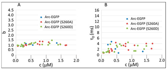 As stated, Zhang et al. [11] identified serine 260 (S260) as a site of dynamic phosphorylation by CaMKII. They showed that a phosphomimetic mutation of this site (S260D) suppressed high-order Arc oligomerization at 30 °C in vitro, whereas the S260A mutation did not affect oligomerization. To address the possibility that the absence of high-order Arc oligomers in the cell cytosol is due to its phosphorylation on serine 260, we carried out FFS analysis of Arc-EGFP (S260D) and Arc-EGFP (S260A). As shown in Figure 3, these mutations had no significant effects on the stoichiometry (Figure 3A) or residence time (Figure 3B) of Arc.