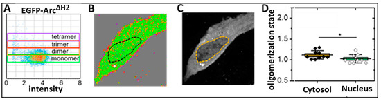 We next monitored the spatial distribution of EGFP-tagged ArcΔH2 within the cell using the Number and Brightness (N&B) method [24] (Figure 5). The N&B approach differs from the molecular brightness method employed in Figure 2 and Figure 3 by providing information from each pixel and, hence, from all areas of the cell. We expressed ArcΔH2-EGFP, and EGFP-ArcΔH2 in NIH-3T3 cells, and representative brightness plots of single cells are shown in Figure 5A. The brightness ranges of monomers, dimers, trimers, and tetramers are indicated by green, orange, red, and purple boxes (calibrated with a solution of monomeric EGFP). Based on this color scheme, Figure 5B shows the brightness maps of representative cells, with their fluorescence intensity images shown in Figure 5C. We quantified the oligomerization state as a function of the intracellular protein concentration as shown in Figure 5D, each point representing the average of a single cell. Statistical analysis of the measured oligomerization state showed that ArcΔH2 is almost exclusively monomeric in both the cell cytoplasm and nucleus.