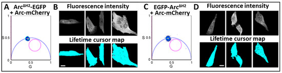 Finally, to ascertain that ArcΔH2 cannot dimerize with wild-type Arc (ArcWT), we measured Förster resonance energy transfer (FRET) in cells expressing ArcΔH2-EGFP or EGFP-ArcΔH2 together with ArcWT-mCherry. FRET can occur if an acceptor fluorophore, in our case mCherry, comes within a few nanometers of a donor, EGFP. Both the intensity and lifetime of the donor are reduced by energy transfer. However, because lifetime measurements are more reliable reporters of FRET in living cells, we measured FRET by reduction in the lifetime of EGFP. Using a similar approach, we had previously detected strong FRET signals in NIH-3T3 cells co-expressing ArcWT-EGFP and ArcWT-mCherry [16]. In contrast, no FRET was observed between EGFP-tagged ArcΔH2 and ArcWT-mCherry (Figure 6). The fluorescence lifetime of each pixel was calculated and displayed using phasor plots [25]. Figure 6A,C show that the center of mass of the lifetime distributions fall on the universal semicircle, indicating a single exponential lifetime decay, as expected for unquenched EGFP. In Figure 6B,D (bottom row of panels), these pixels are highlighted with a cyan color, showing their uniform distribution within the entire cell. Almost no quenched EGFP was detected, as demonstrated by the absence of pixels highlighted with a magenta color in the cells. The corresponding fluorescence intensity images for EGFP-ArcΔH2 are shown in Figure 6B,D (top row of panels). These results independently confirm that the H2 domain is critical for Arc dimerization in cells.