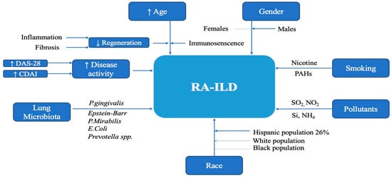 Workplace exposure to silica, ammonium, mineral dust, and black carbon particles increases the risk of developing pulmonary manifestations in RA [,,,]. Following contact with external pollutants, an elevated number of inflammatory cells and cytokines are secreted and this causes the inflammatory reaction. Regarding the disruption of the immune system, any change participates in the activation of the inflammatory process, both local and systemic. Liu et al. evidenced that environmental pollutants such as PM2.5, PM10, sulfur dioxide, and nitrogen dioxide may be considered causative factors for frequent hospitalizations in RA-ILD patients []. The exact mechanism of the involvement of air pollutants in the development of RA-ILD is not yet fully understood.