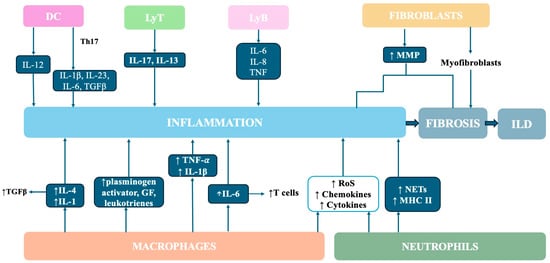 The role of macrophages, neutrophils, fibroblasts, dendritic cells, and T and B cells in the pathogenesis of RA-ILD. MMP—matrix metalloproteinase, TGFβ—transforming growth factor beta, IL—interleukin, GF—growth factor, TNF-α—tumor necrosis factor alpha, RoS—reactive oxygen species, NET—neutrophil extracellular trap, MHC II—major histocompatibility complex class II, DC—dendritic cells, LyT—lymphocyte T, LyB—lymphocyte B.