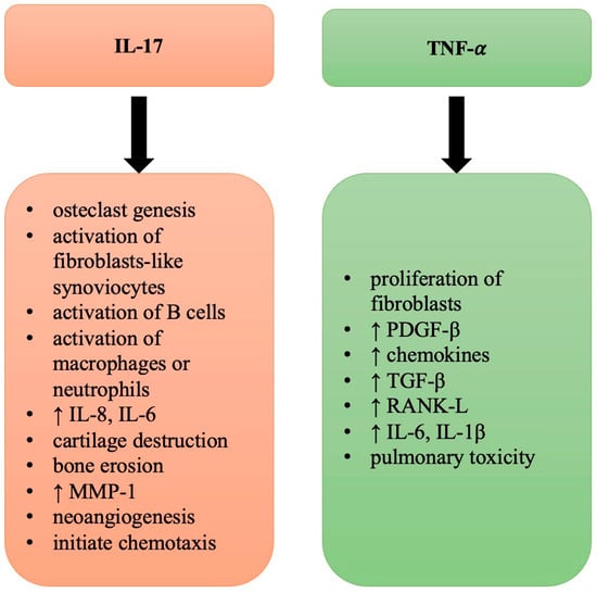 TNF-α is one of the main regulators. TNF-α is a proinflammatory cytokine associated with ILD evolution. It stimulates the proliferation of fibroblasts and activates the expression of cytokines, PDGF-β, chemokines, and TGF-β [,,]. TNF-α inhibitors are frequently used in the treatment of RA. However, more and more studies have suggested that TNF-α inhibitors are correlated with ILD development and can cause pulmonary toxicity [,]. Cytokines secreted by T cells are IFN-γ, interleukin (IL)-17A, receptor activator of nuclear factor KB ligand (RANK-L), and TNF-α []. TNF-α is also produced by B cells, NK-cells, and synovial macrophages. TNF-α has been proven to induce bone resorption and cartilage degradation; it also increases RANK-L secretion by osteocytes []. There are studies that have highlighted that TNF-α can directly stimulate the differentiation of the monocyte/macrophage lineage cells into osteoclasts through a mechanism independent of RANK-L. The second key role of TNF-α in inflammation is the capacity to stimulate the production of other inflammatory cytokines like IL-6 and IL-1β. These cytokines attract leukocytes and promote the formation of an inflammatory milieu in the synovial membrane [].