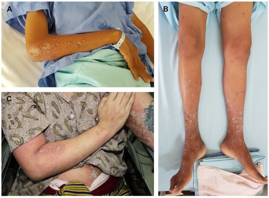 - Navarini, A.A.; Burden, A.D.; Capon, F.; Mrowietz, U.; Puig, L.; Koks, S.; Kingo, K.; Smith, C.; Barker, J.N.; Network, E. European consensus statement on phenotypes of pustular psoriasis. J. Eur. Acad. Dermatol. Venereol. 2017, 31, 1792–1799. [Google Scholar] [CrossRef] [PubMed]