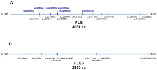 A few variants were identified in previous ClinVar records and were subsequently assessed for their putative clinical significance using VarSome. For FLG, three were classified as benign (B), eight as likely benign (LB), and one as pathogenic (P), while no data were available for eight variants. Notably, for eight FLG variants and all identified FLG3 variants there was a lack of available data that would facilitate a putative clinical classification (refer to Tables S1–S4).