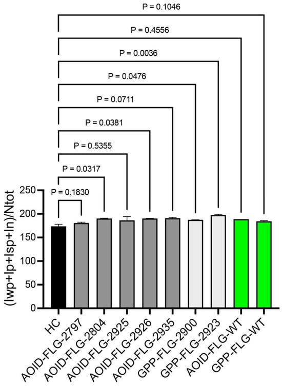 Quantitation of immunoreactive FLG protein in skin biopsies. Bar graph displaying means along with standard deviations (SDs). Mixed-effects analysis was utilized, followed by Dunnett’s multiple comparison test. The immunoreactivity of FLG in AOID-PR and PP was compared to that of healthy controls. Bars without any symbol indicate no statistical significance. HC = healthy control; FLG-WT = wild-type filaggrin. Statistical significance was defined as a p-value < 0.05.