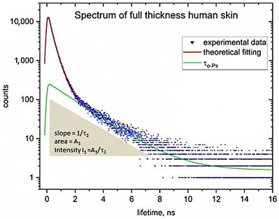 To sum up, using the unique PALS method, this work provides experimental evidence for the existence of free volumes in the human SC. Although there are several mathematical models for calculating this skin nanospaces, PALS emerges as the preferred choice for obtaining experimental data. The results presented in this paper align with experimental results for animal skin [] and cancerous skin [,,], although they are lower than theoretical values [,]. It should be emphasized that if no free volumes were present in the biological material studied, no o-Ps would be formed, i.e., no third component τ3 would be obtained [,].